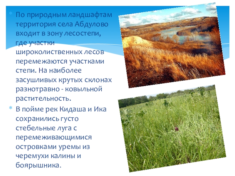 Слайд 12По природным ландшафтам территория села Абдулово входит в зону лесостепи, где