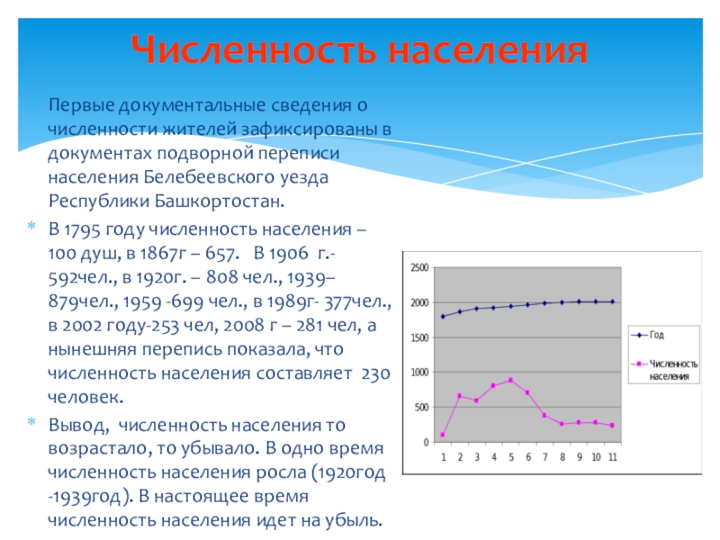 Вывод, численность населения то возрастало, то убывало. В одно время численность населения росла (1920год -1939год). В настоящее время численность населения идет на убыль.
