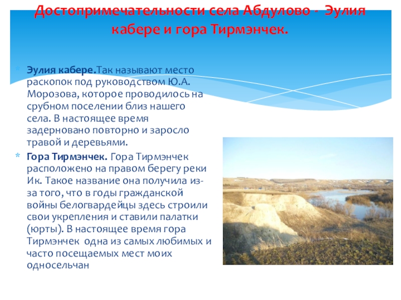 Гора Тирмэнчек. Гора Тирмэнчек расположено на правом берегу реки Ик. Такое название она получила из-за того, что в годы гражданской войны белогвардейцы здесь строили свои укрепления и ставили палатки (юрты). В настоящее время гора Тирмэнчек одна из самых любимых и часто посещаемых мест моих односельчан
