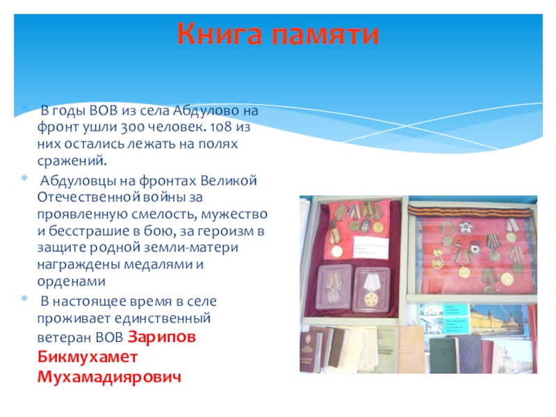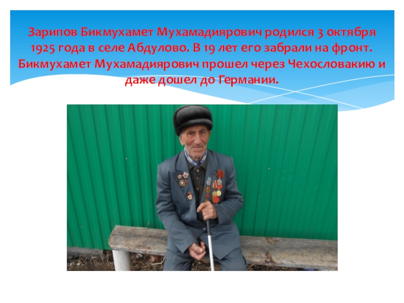 Слайд 16Зарипов Бикмухамет Мухамадиярович родился 3 октября 1925 года в селе Абдулово.