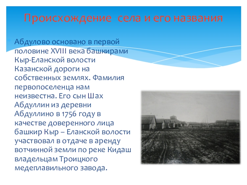 башкирами Кыр-Еланской волости Казанской дороги на собственных землях. Фамилия первопоселенца нам неизвестна. Его сын Шах Абдуллин из деревни Абдуллино в 1756 году в качестве доверенного лица башкир Кыр – Еланской волости участвовал в отдаче в аренду вотчинной земли по реке Кидаш владельцам Троицкого медеплавильного завода.