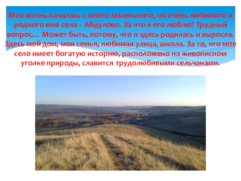 мне села – Абдулово. За что я его люблю? Трудный вопрос… Может быть, потому, что я здесь родилась и выросла. Здесь мой дом, моя семья, любимая улица, школа. За то, что мое село имеет богатую историю, расположено на живописном уголке природы, славится трудолюбивыми сельчанами.