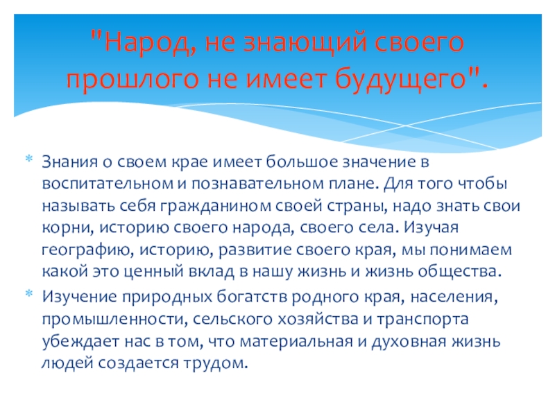 имеет большое значение в воспитательном и познавательном плане. Для того чтобы называть себя гражданином своей страны, надо знать свои корни, историю своего народа, своего села. Изучая географию, историю, развитие своего края, мы понимаем какой это ценный вклад в нашу жизнь и жизнь общества.