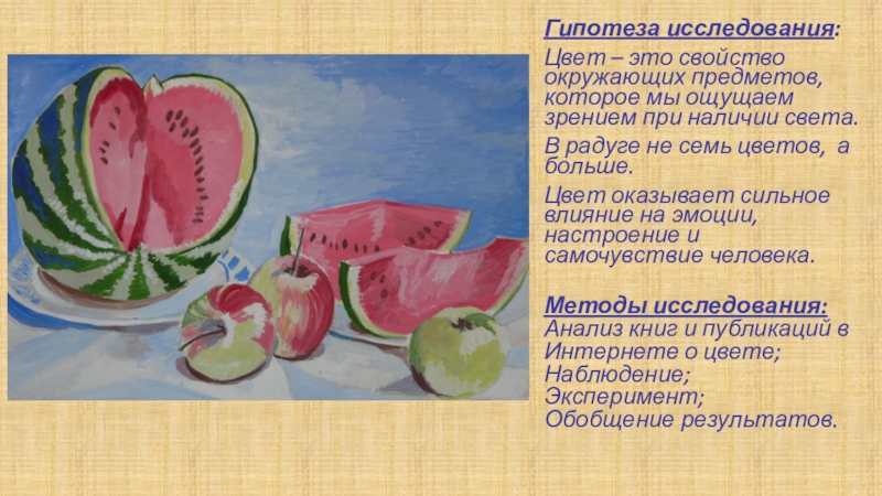 цветами отобразить красоту окружающего мира. Все предметы вокруг нас имеют свой цвет. Цвет влияет на настроение: если на улице серая мрачная погода, становится грустно, а если светит яркое солнце на синем небе, становится радостно на душе. Меня интересует: почему мы видим цвета, как они получаются, сколько цветов существует и как цвет влияет на человека. Пытаясь в этом разобраться, я выбрала тему