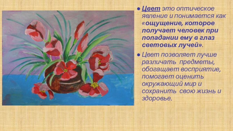 Цвет позволяет лучше различать предметы, обогащает восприятие, помогает оценить окружающий мир и сохранить свою жизнь и здоровье.