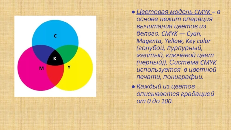 белого. CMYK — Cyan, Magenta, Yellow, Key color (голубой, пурпурный, желтый, ключевой цвет (черный)). Система CMYK используется в цветной печати, полиграфии.