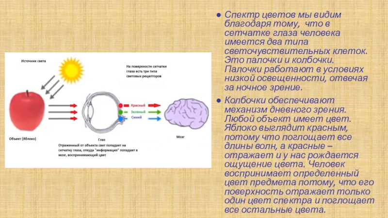 Колбочки обеспечивают механизм дневного зрения. Любой объект имеет цвет. Яблоко выглядит красным, потому что поглощает все длины волн, а красные – отражает и у нас рождается ощущение цвета. Человек воспринимает определенный цвет предмета потому, что его поверхность отражает только один цвет спектра и поглощает все остальные цвета.