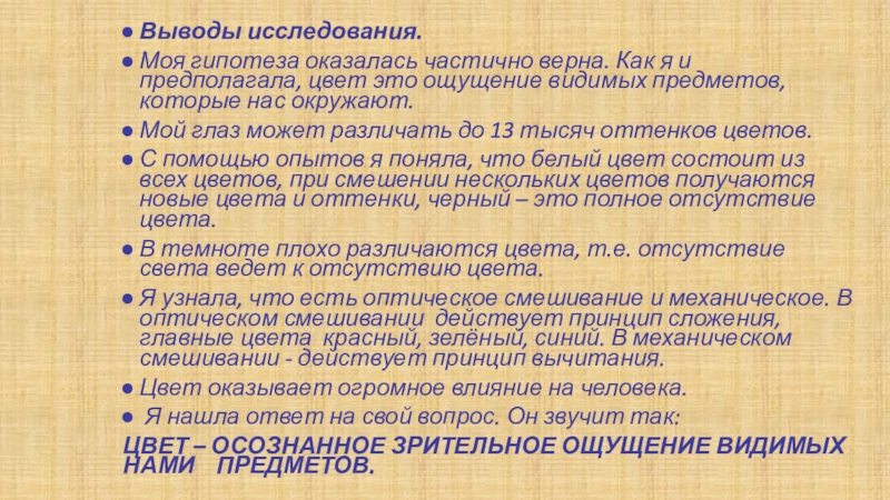С помощью опытов я поняла, что белый цвет состоит из всех цветов, при смешении нескольких цветов получаются новые цвета и оттенки, черный – это полное отсутствие цвета.