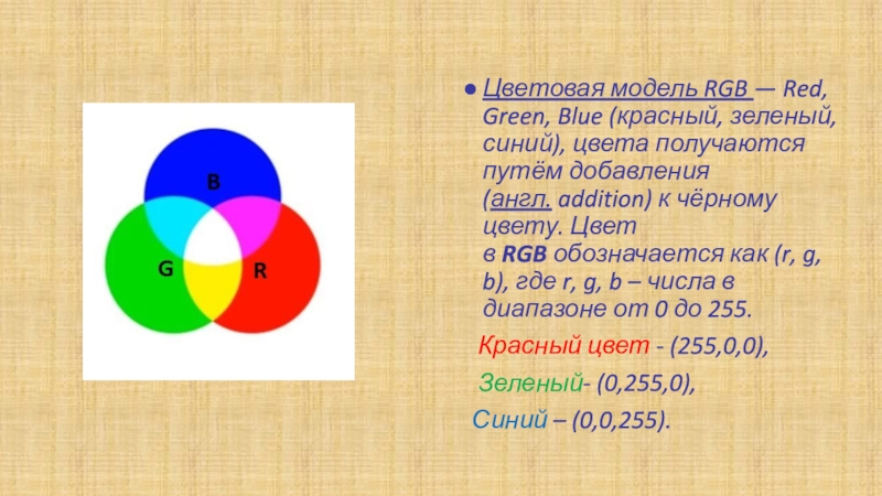 получаются путём добавления (англ. addition) к чёрному цвету. Цвет в RGB обозначается как (r, g, b), где r, g, b – числа в диапазоне от 0 до 255.