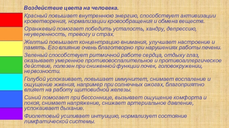 Слайд 17 Воздействие цвета на человека.