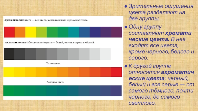 Слайд 10Зрительные ощущения цвета разделяют на две группы.