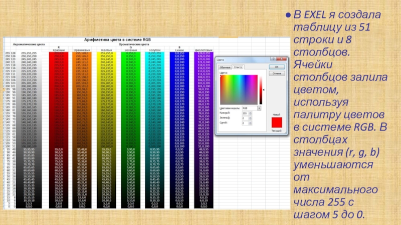 Ячейки столбцов залила цветом, используя палитру цветов в системе RGB. В столбцах значения (r, g, b) уменьшаются от максимального числа 255 с шагом 5 до 0.