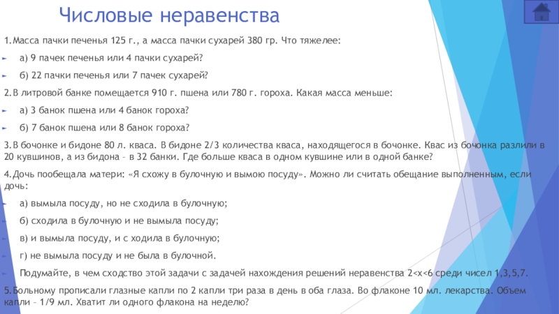 Подумайте, в чем сходство этой задачи с задачей нахождения решений неравенства 25.Больному прописали глазные капли по 2 капли три раза в день в оба глаза. Во флаконе 10 мл. лекарства. Объем капли – 1/9 мл. Хватит ли одного флакона на неделю?