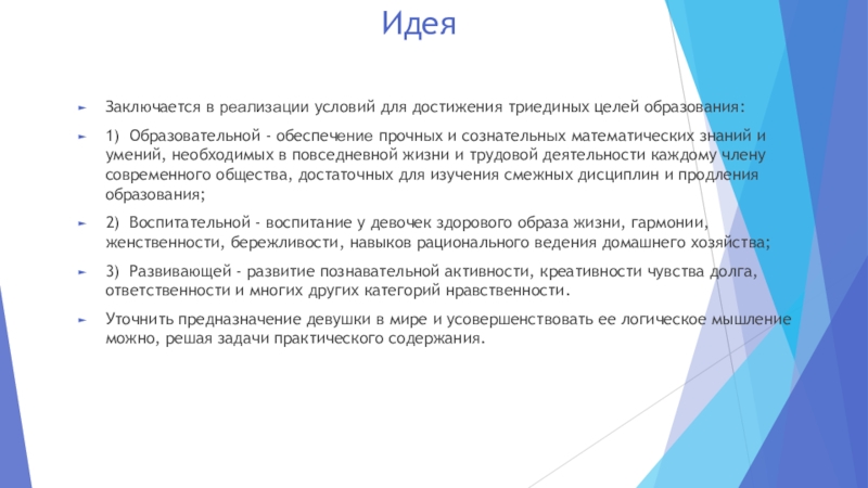 Заключается в реализации условий для достижения триединых целей образования:
