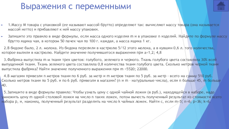 Запишите это правило в виде формулы, если масса одного изделия m и в упаковке n изделий. Найдите по формуле массу брутто ящика чая, в котором 50 пачек чая по 100 г. каждая, а масса ящика 1 кг.