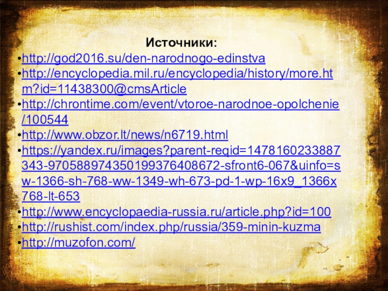 Источники:http://god2016.su/den-narodnogo-edinstva http://encyclopedia.mil.ru/encyclopedia/history/more.htm?id=11438300@cmsArticlehttp://chrontime.com/event/vtoroe-narodnoe-opolchenie/100544http://www.obzor.lt/news/n6719.htmlhttps://yandex.ru/images?parent-reqid=1478160233887343-970588974350199376408672-sfront6-067&uinfo=sw-1366-sh-768-ww-1349-wh-673-pd-1-wp-16x9_1366x768-lt-653http://www.encyclopaedia-russia.ru/article.php?id=100http://rushist.com/index.php/russia/359-minin-kuzmahttp://muzofon.com/