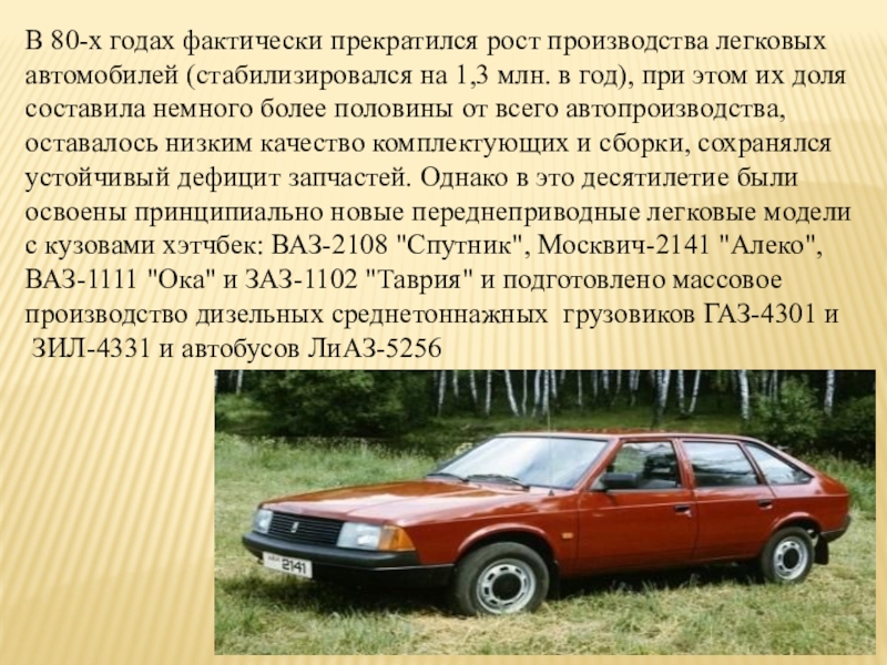 1,3 млн. в год), при этом их доля составила немного более половины от всего автопроизводства, оставалось низким качество комплектующих и сборки, сохранялся устойчивый дефицит запчастей. Однако в это десятилетие были освоены принципиально новые переднеприводные легковые модели с кузовами хэтчбек: ВАЗ-2108 "Спутник", Москвич-2141 "Алеко", ВАЗ-1111 "Ока" и ЗАЗ-1102 "Таврия" и подготовлено массовое
