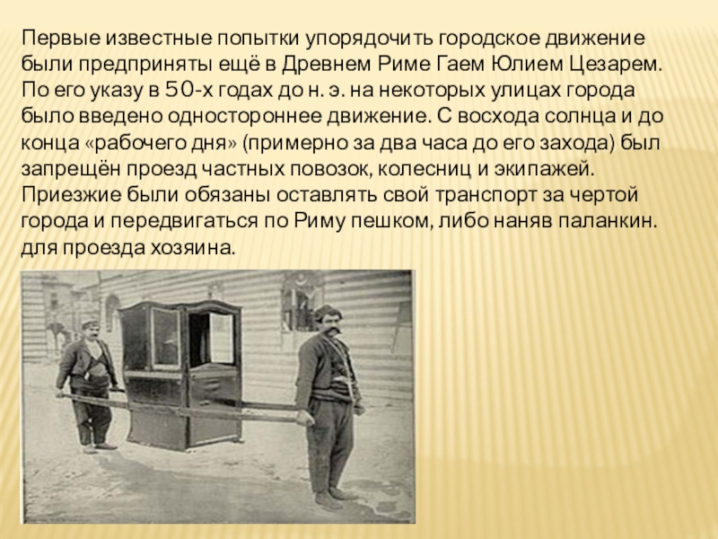 Риме Гаем Юлием Цезарем. По его указу в 50-х годах до н. э. на некоторых улицах города было введено одностороннее движение. С восхода солнца и до конца «рабочего дня» (примерно за два часа до его захода) был запрещён проезд частных повозок, колесниц и экипажей. Приезжие были обязаны оставлять свой транспорт за чертой города и передвигаться по Риму пешком, либо наняв паланкин. для проезда хозяина.