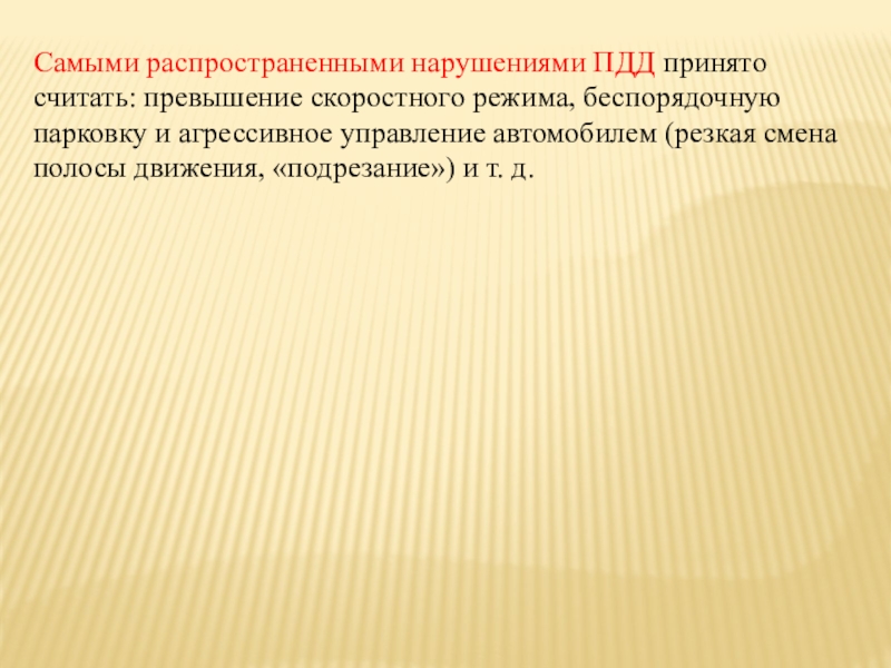 Слайд 22Самыми распространенными нарушениями ПДД принято считать: превышение скоростного режима, беспорядочную парковку
