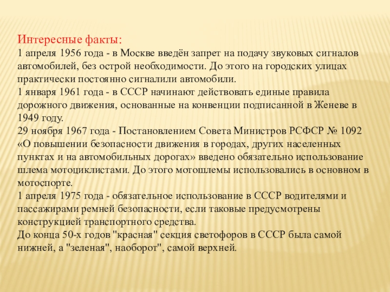 1 января 1961 года - в СССР начинают действовать единые правила дорожного движения, основанные на конвенции подписанной в Женеве в 1949 году.