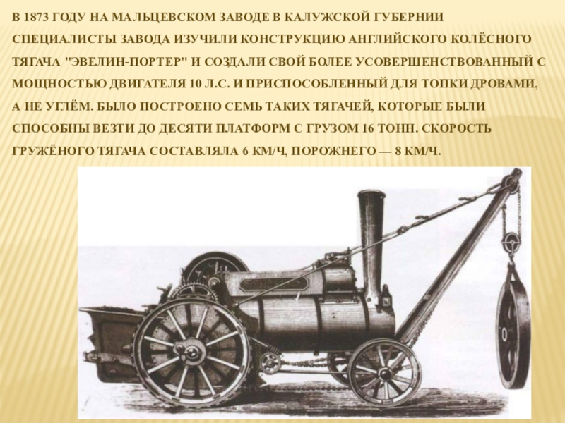 Слайд 7В 1873 году на Мальцевском заводе в Калужской губернии специалисты завода