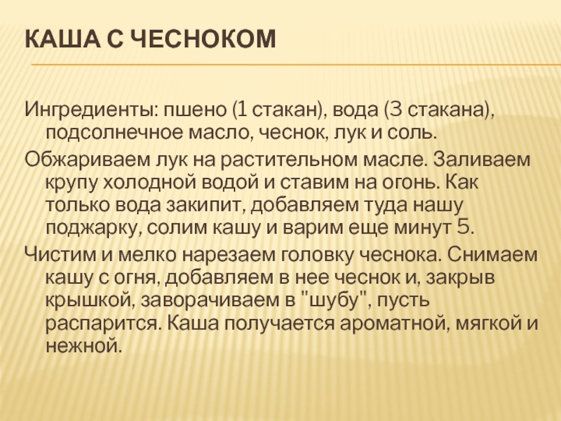 Чистим и мелко нарезаем головку чеснока. Снимаем кашу с огня, добавляем в нее чеснок и, закрыв крышкой, заворачиваем в "шубу", пусть распарится. Каша получается ароматной, мягкой и нежной.