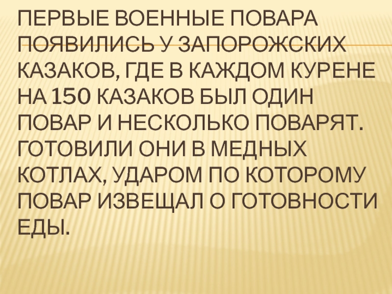 Слайд 5Первые военные повара появились у запорожских казаков, где в каждом курене