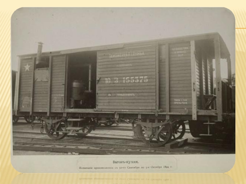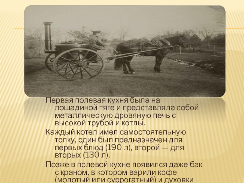 Слайд 20Первая полевая кухня была на лошадиной тяге и представляла собой металлическую