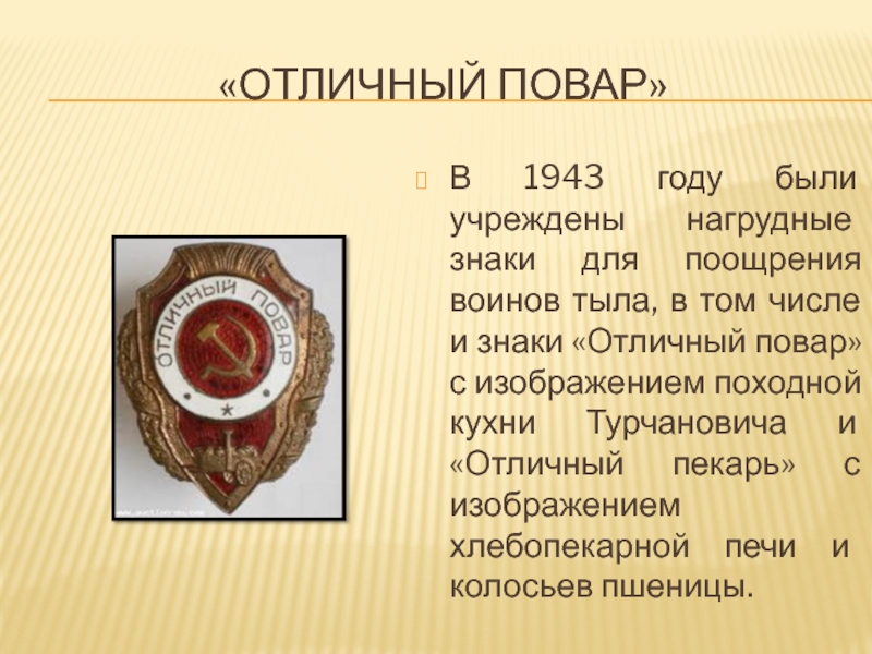 тыла, в том числе и знаки «Отличный повар» с изображением походной кухни Турчановича и «Отличный пекарь» с изображением хлебопекарной печи и колосьев пшеницы.