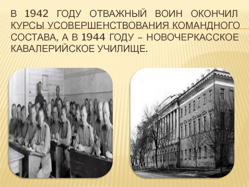 Слайд 27В 1942 году отважный воин окончил курсы усовершенствования командного состава, а