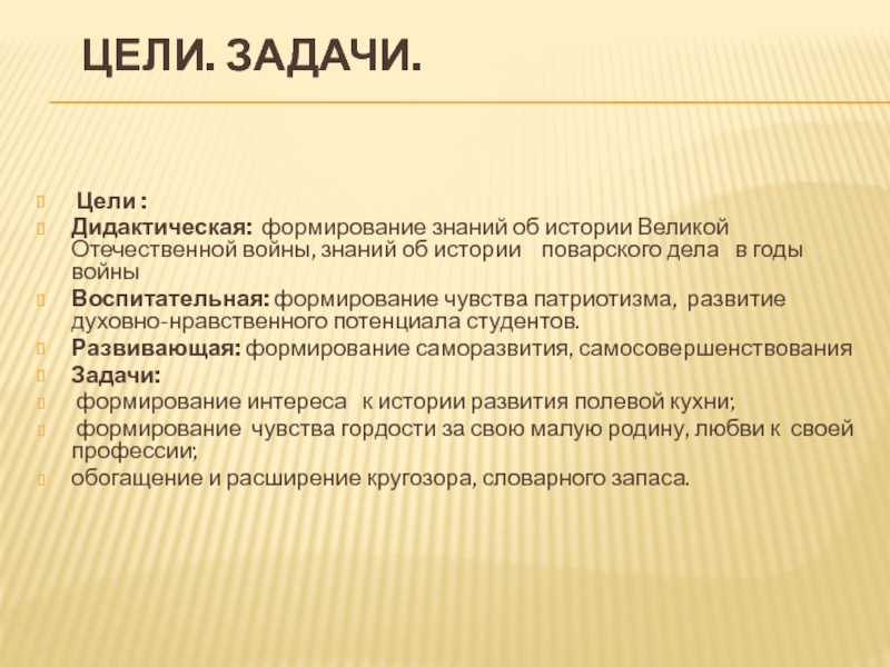 Отечественной войны, знаний об истории поварского дела в годы войны