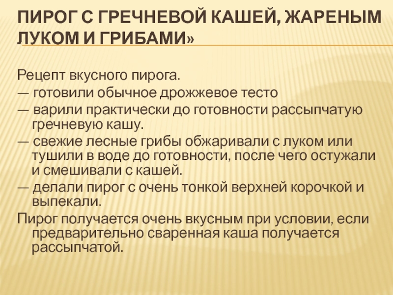 Слайд 16Пирог с гречневой кашей, жареным луком и грибами»