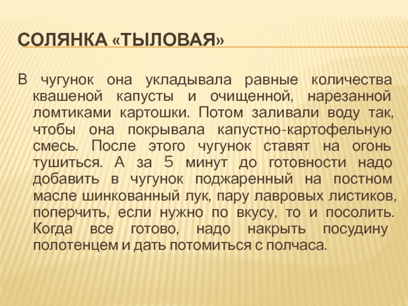 нарезанной ломтиками картошки. Потом заливали воду так, чтобы она покрывала капустно-картофельную смесь. После этого чугунок ставят на огонь тушиться. А за 5 минут до готовности надо добавить в чугунок поджаренный на постном масле шинкованный лук, пару лавровых листиков, поперчить, если нужно по вкусу, то и посолить. Когда все готово, надо накрыть посудину полотенцем и дать потомиться с полчаса.