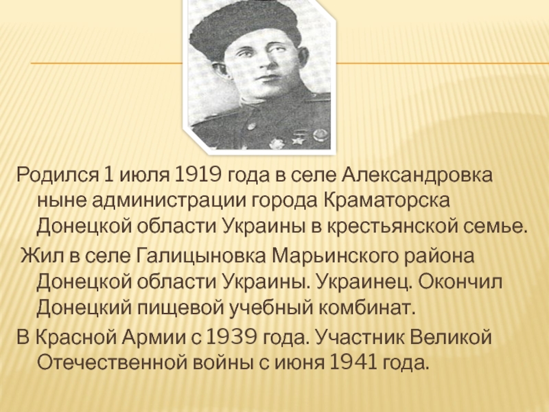 Слайд 26Родился 1 июля 1919 года в селе Александровка ныне администрации города