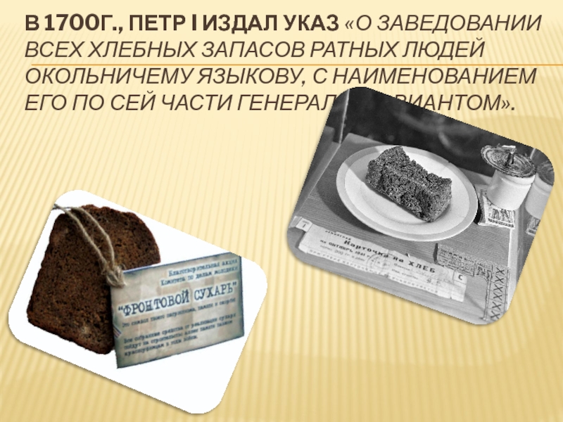 Слайд 3В 1700г., Петр I издал указ «О заведовании всех хлебных запасов ратных