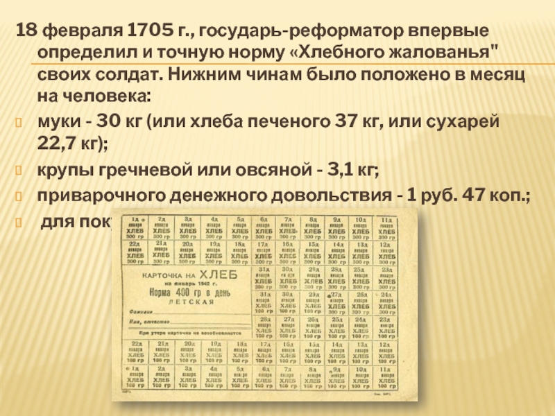 Слайд 418 февраля 1705 г., государь-реформатор впервые определил и точную норму «Хлебного