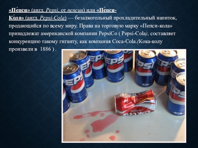 Слайд 2«Пе́пси» (англ. Pepsi, от пепсин) или «Пе́пси-Ко́ла» (англ. Pepsi-Cola) — безалкогольный прохладительный напиток, продающийся по всему миру. Права на торговую марку