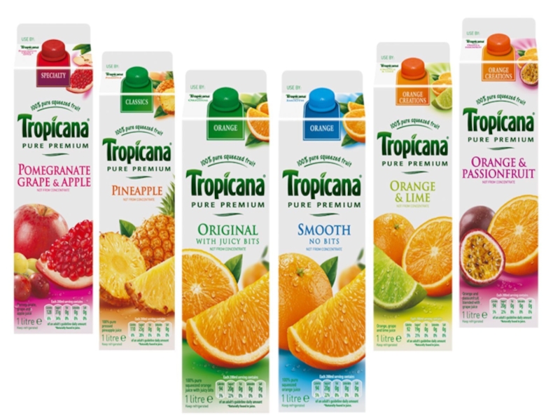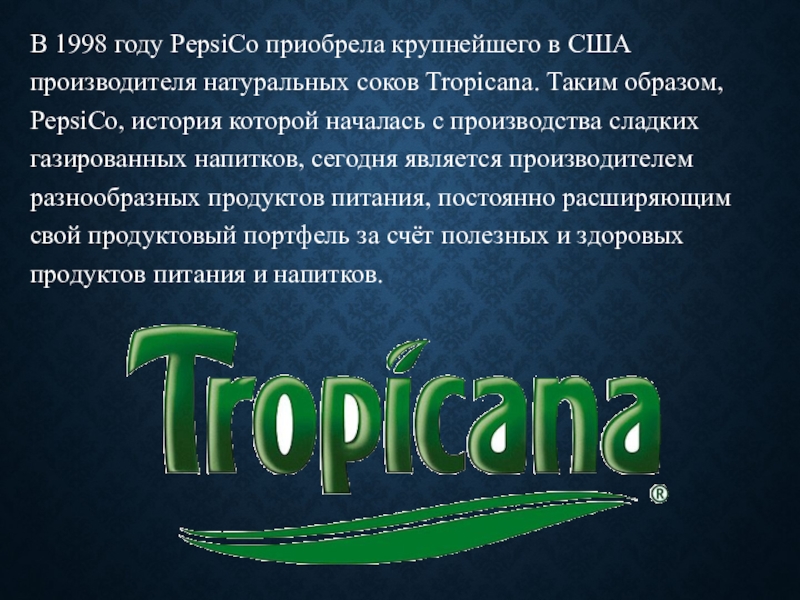 Tropicana. Таким образом, PepsiCo, история которой началась с производства сладких газированных напитков, сегодня является производителем разнообразных продуктов питания, постоянно расширяющим свой продуктовый портфель за счёт полезных и здоровых продуктов питания и напитков.