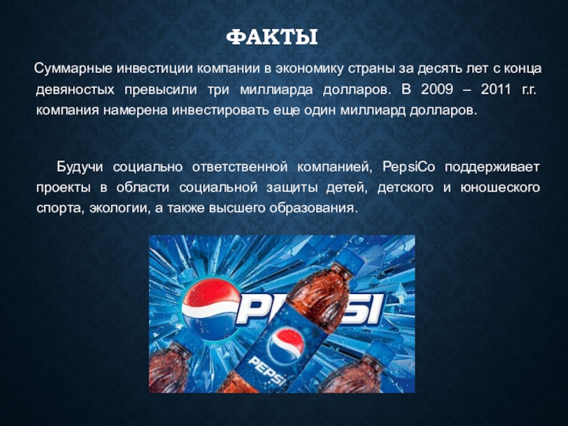 Будучи социально ответственной компанией, PepsiCo поддерживает проекты в области социальной защиты детей, детского и юношеского спорта, экологии, а также высшего образования.