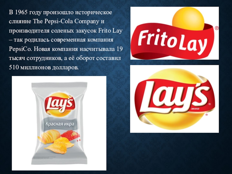 соленых закусок Frito Lay – так родилась современная компания PepsiCo. Новая компания насчитывала 19 тысяч сотрудников, а её оборот составил 510 миллионов долларов.