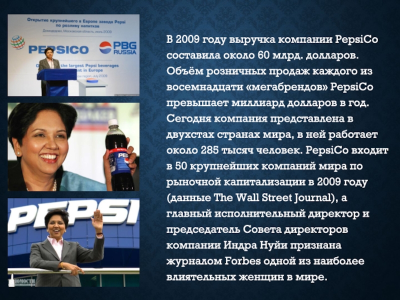 Объём розничных продаж каждого из восемнадцати «мегабрендов» PepsiCo превышает миллиард долларов в год. Сегодня компания представлена в двухстах странах мира, в ней работает около 285 тысяч человек. PepsiCo входит в 50 крупнейших компаний мира по рыночной капитализации в 2009 году (данные The Wall Street Journal), а главный исполнительный директор и председатель Совета директоров компании Индра Нуйи признана журналом Forbes одной из наиболее влиятельных женщин в мире.
