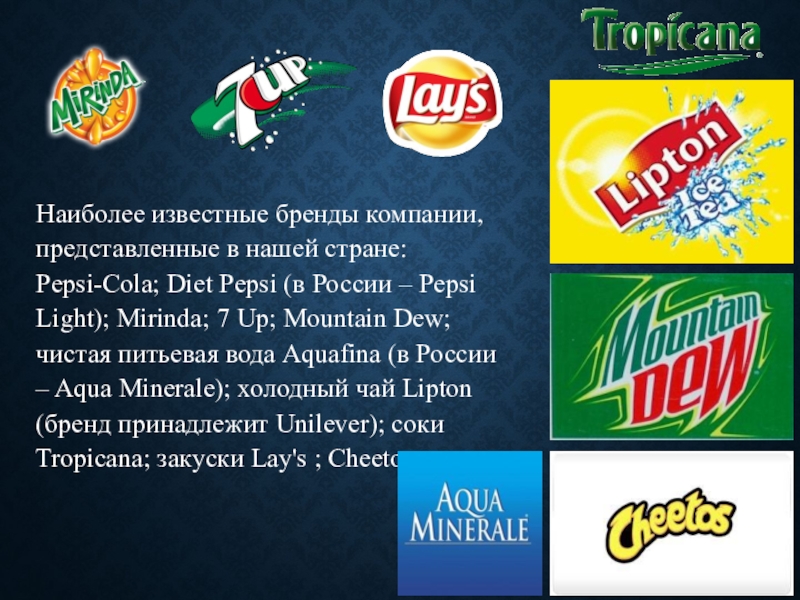 (в России – Pepsi Light); Mirinda; 7 Up; Mountain Dew; чистая питьевая вода Aquafina (в России – Aqua Minerale); холодный чай Lipton (бренд принадлежит Unilever); соки Tropicana; закуски Lay's ; Cheetos.