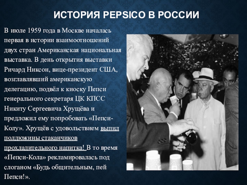 в истории взаимоотношений двух стран Американская национальная выставка. В день открытия выставки Ричард Никсон, вице-президент США, возглавлявший американскую делегацию, подвёл к киоску Пепси генерального секретаря ЦК КПСС Никиту Сергеевича Хрущёва и предложил ему попробовать «Пепси-Колу». Хрущёв с удовольствием выпил полдюжины стаканчиков прохладительного напитка! В то время «Пепси-Кола» рекламировалась под слоганом «Будь общительным, пей Пепси!».