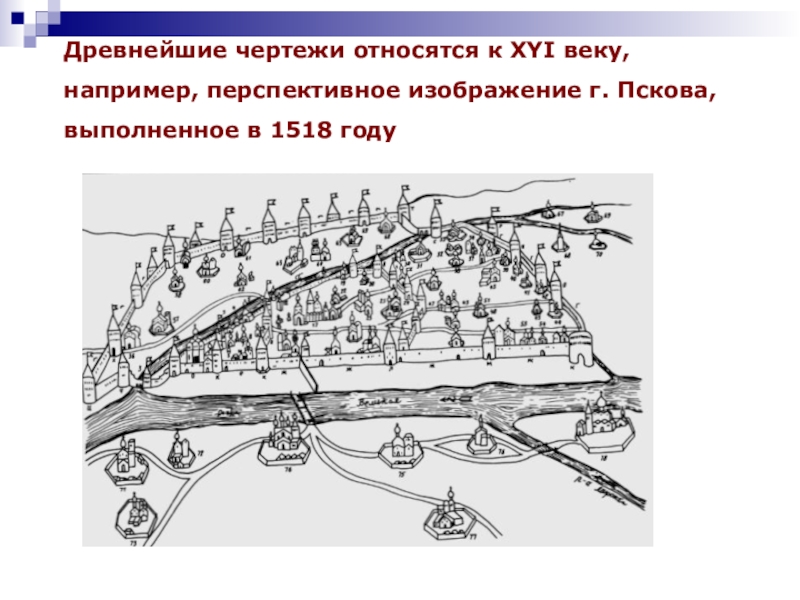 Слайд 7Древнейшие чертежи относятся к XYI веку, например, перспективное изображение г. Пскова,