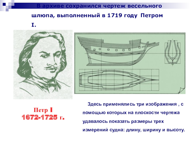 Здесь применялись три изображения , с помощью которых на плоскости чертежа удавалось показать размеры трех измерений судна: длину, ширину и высоту.