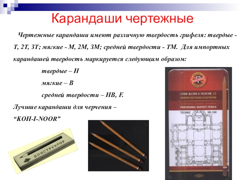 Чертежные карандаши имеют различную твердость грифеля: твердые - Т,