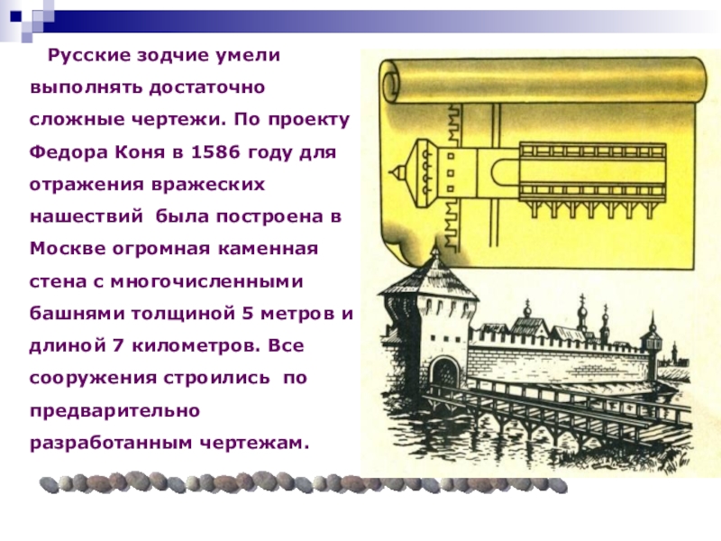 в 1586 году для отражения вражеских нашествий была построена в Москве огромная каменная стена с многочисленными башнями толщиной 5 метров и длиной 7 километров. Все сооружения строились по предварительно разработанным чертежам.