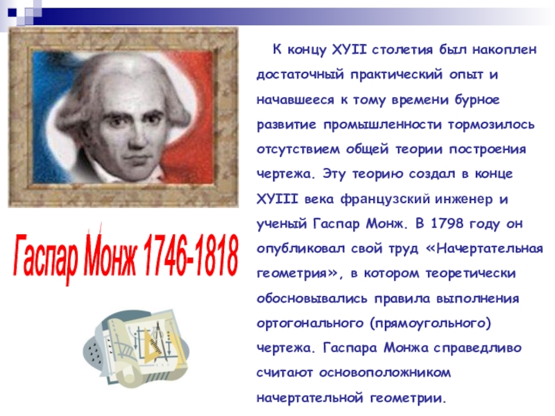 и начавшееся к тому времени бурное развитие промышленности тормозилось отсутствием общей теории построения чертежа. Эту теорию создал в конце XYIII века французский инженер и ученый Гаспар Монж. В 1798 году он опубликовал свой труд «Начертательная геометрия», в котором теоретически обосновывались правила выполнения ортогонального (прямоугольного) чертежа. Гаспара Монжа справедливо считают основоположником начертательной геометрии.