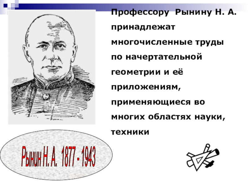 Профессору Рынину Н. А. принадлежат многочисленные труды по начертательной геометрии и
