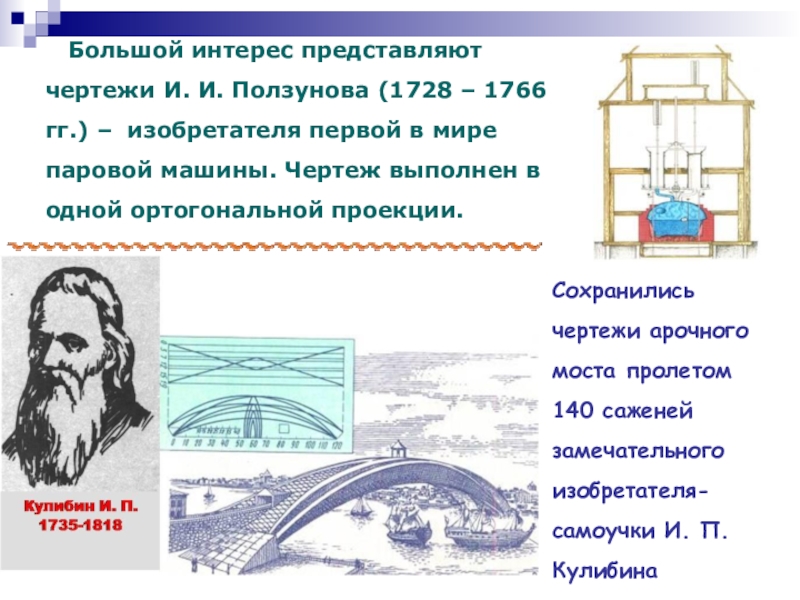 Слайд 8 Большой интерес представляют чертежи И. И. Ползунова (1728 –